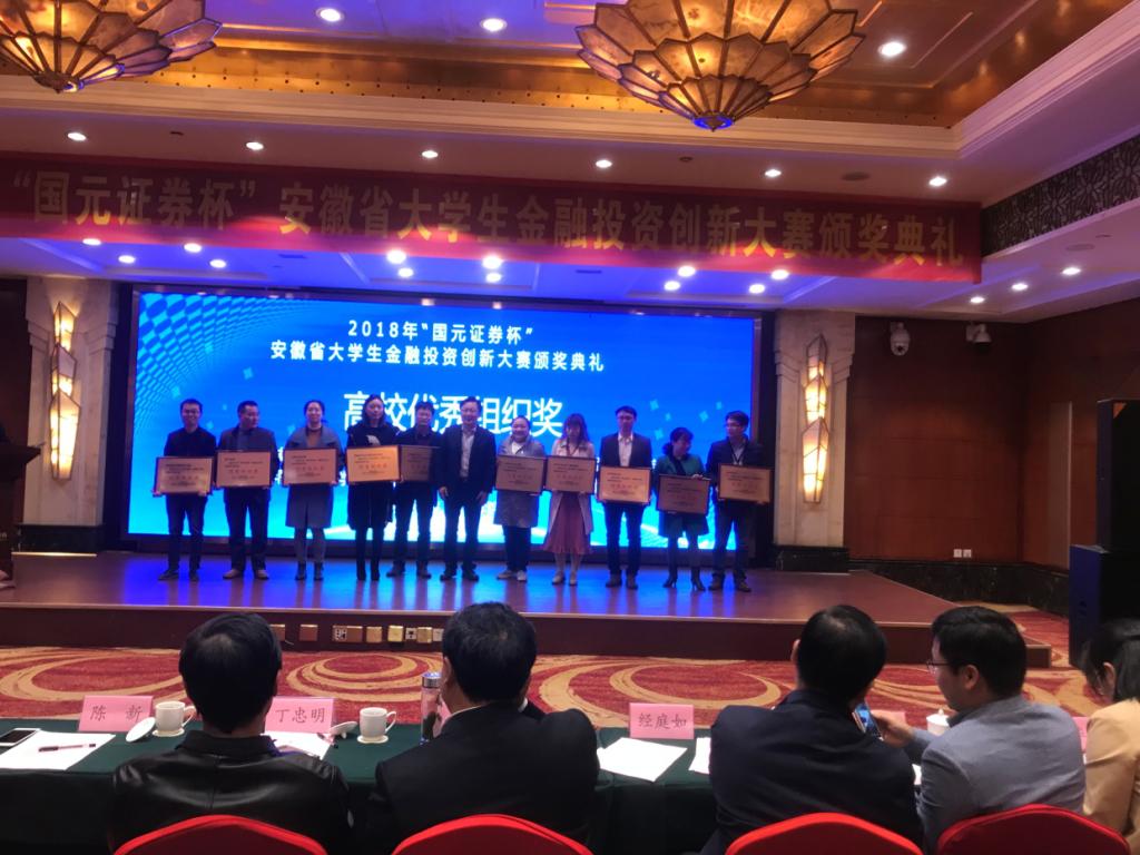 11月7日,第三届“国元证券杯”安徽省大学生金融投资创新大赛颁奖典礼在蚌埠隆重举行。我校经管学院金融工程专业负责人刘根节应邀出席,并代表学校上台领取高校优秀组织奖。
