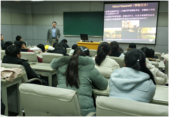 3月20日下午,美国拿撒勒大学语言学院院长、亚太办公室主任宋红专博士在C楼406教室为我院17级国际经济与贸易中外合作班的学生举办有关中外合作教学的教育讲座。学院院长杨国才、副院长潘锦云、17级国合班辅导员孙栎简老师以及17级国合班全体同学参加了此次讲座。