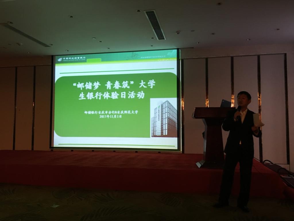 本次活动分三阶段进行。首先,银行工作人员引导师生参观了邮政储蓄银行,对银行负债业务、中间业务及资产业务进行了详细介绍。随后,全体师生移步会议室,听取了邮储银行电子银行部宋部长的精彩讲座,宋部长从邮储银行概况、业务展示、企业文化、校园招聘、基金定投比赛、有奖问答等六个方面对邮储银行做了全方位的讲解。最后,全体教师和银行相关人员举行了简短的座谈。会上,潘锦云介绍了bv1946伟德及经管学院近年良好的发展态势,邮储银行廖革红副行长对邮储银行在安庆的成功发展也做了简要介绍。