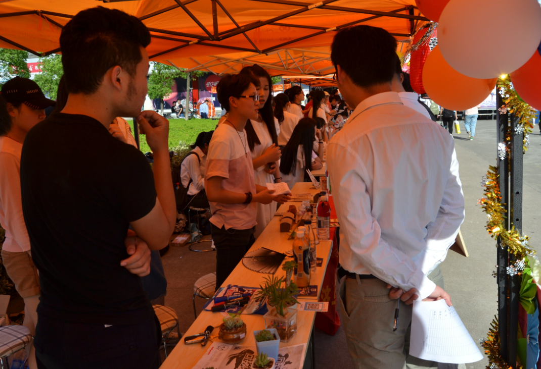 比赛共有13个班级参赛,分为评委老师评分、班级产品介绍以及才艺展示三个环节。炎热的天气胜不过同学们的热情,伴随着富有激情的开场舞,绚丽的文艺表演开始了。13个帐篷依次排开,展台各具特色,摆满了琳琅满目的创意商品。金融工程一班的折纸星星,海洋瓶,钥匙扣,班级负责人也向评委们介绍着本班级的风采与特色。一袭中国风映入眼帘,翩翩少年作揖迎贵人,国际经济与贸易专业展台上摆着各式各样的簪子,别具风格的海报吸引着每个过路人的眼球。物流专业的童年零食铺、乐器之家,市场营销专业的古韵古风,带领每一个驻足展台的人追忆着最童真的美好回忆,欣赏着尤克里里和古筝碰撞出完美的旋律,品味着中华优秀文化美好的韵味。舞台上各专业班级介绍着营销理念,用表演将产品营销理念潜移默化的推向观众。动人的歌曲,翩若惊鸿的舞蹈,趣味百出的话剧,场面热闹非凡,缤纷多彩。