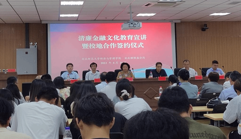 2023年6月16日,伟德国际victor·1946源自党委书记许俊杰、副院长黄先军、部分教师代表、2022级金融工程专业学生出席了由学院和安庆市银保监分局联合承办的清廉金融文化教育宣讲会暨伟德国际victor·1946源自与安庆市银保监分局共建“清廉金融文化教育基地”揭牌仪式。会议由黄先军主持。安庆市银行和保险机构主要负责人、市银协、保协会长等悉数参会,安徽省银保监局、安庆市纪委监委领导应邀出席。