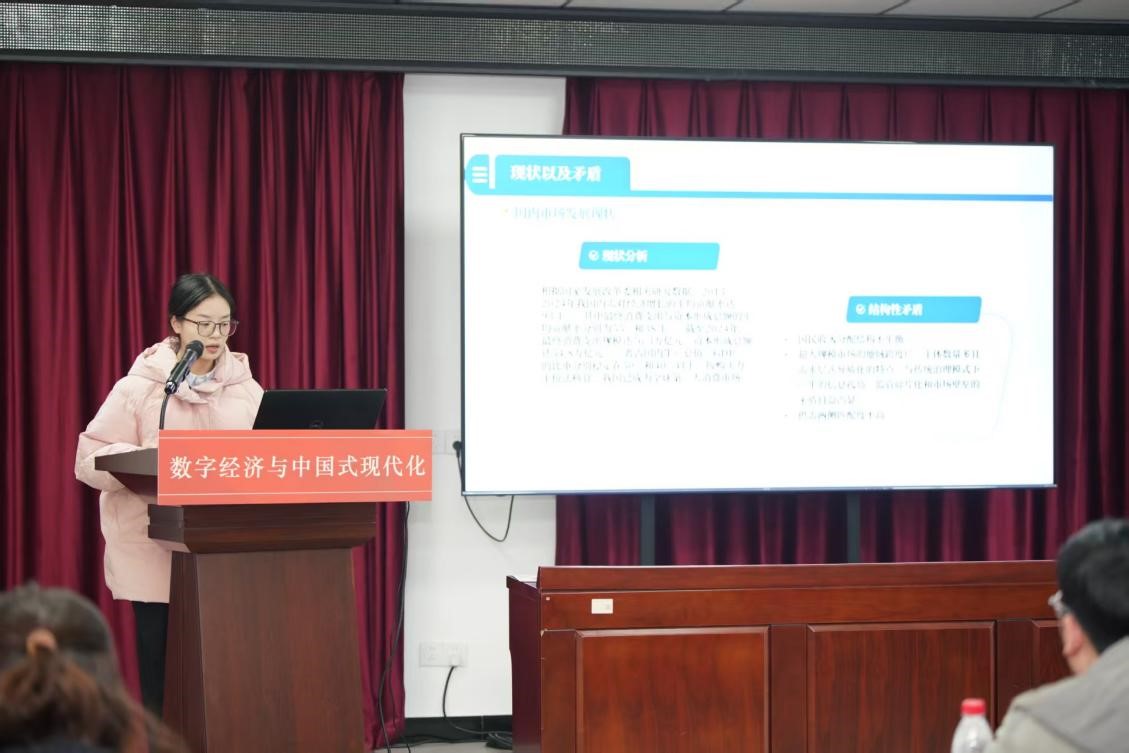 此次会议汇聚了多所高校与党校的专家学者和青年学子,围绕“数字经济与中国式现代化”议题展开深度研讨。安徽大学经济学院教授荣兆梓教授、马怀礼教授、中共安徽省委党校李本和教授等在报告环节发表主旨演讲,在分论坛研讨环节,我院2025级数字经济硕士研究生王如梦围绕所提交论文《数字化治理促进强大国内市场构建的路径分析》进行分享汇报,同与会专家进行交流探讨。