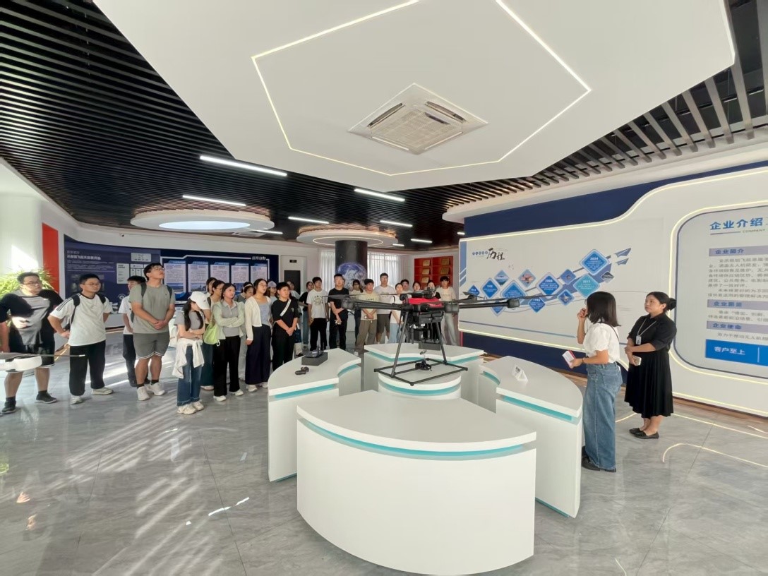 在极铂飞航运营中心,师生们首先参观了内容丰富的低空经济科创展馆。通过讲解员的生动介绍与真实案例展示,大家深入了解到无人机在应急医疗物资运输、电力巡检、公共安全等前沿领域的广泛应用。展馆内陈列的垂直起降固定翼、多旋翼物流运载等先进无人机实体机型,吸引了在场学生的目光。同学们围绕无人机的飞行原理、航线合规申报、智能安全监管等核心问题,与企业技术人员进行了热烈的互动交流。