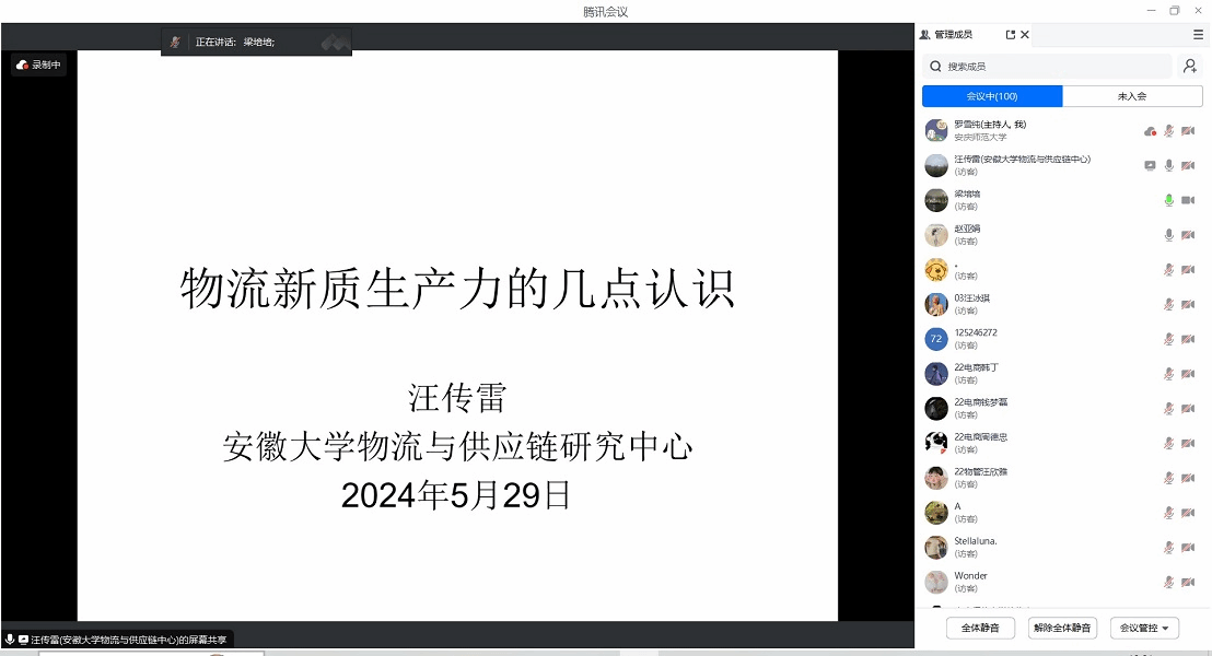 5月29日,由科研处、伟德国际victor·1946源自联合主办,安徽省数字经济研究中心承办的“经管有道”第16期学术报告会开讲。安徽大学汪传雷教授受我院邀请,通过线上方式分享了题为“物流新质生产力的几点认识”的学术报告。学院教师、研究生及物流管理专业本科生共90余人参加了交流活动,报告会由梁培培副教授主持。