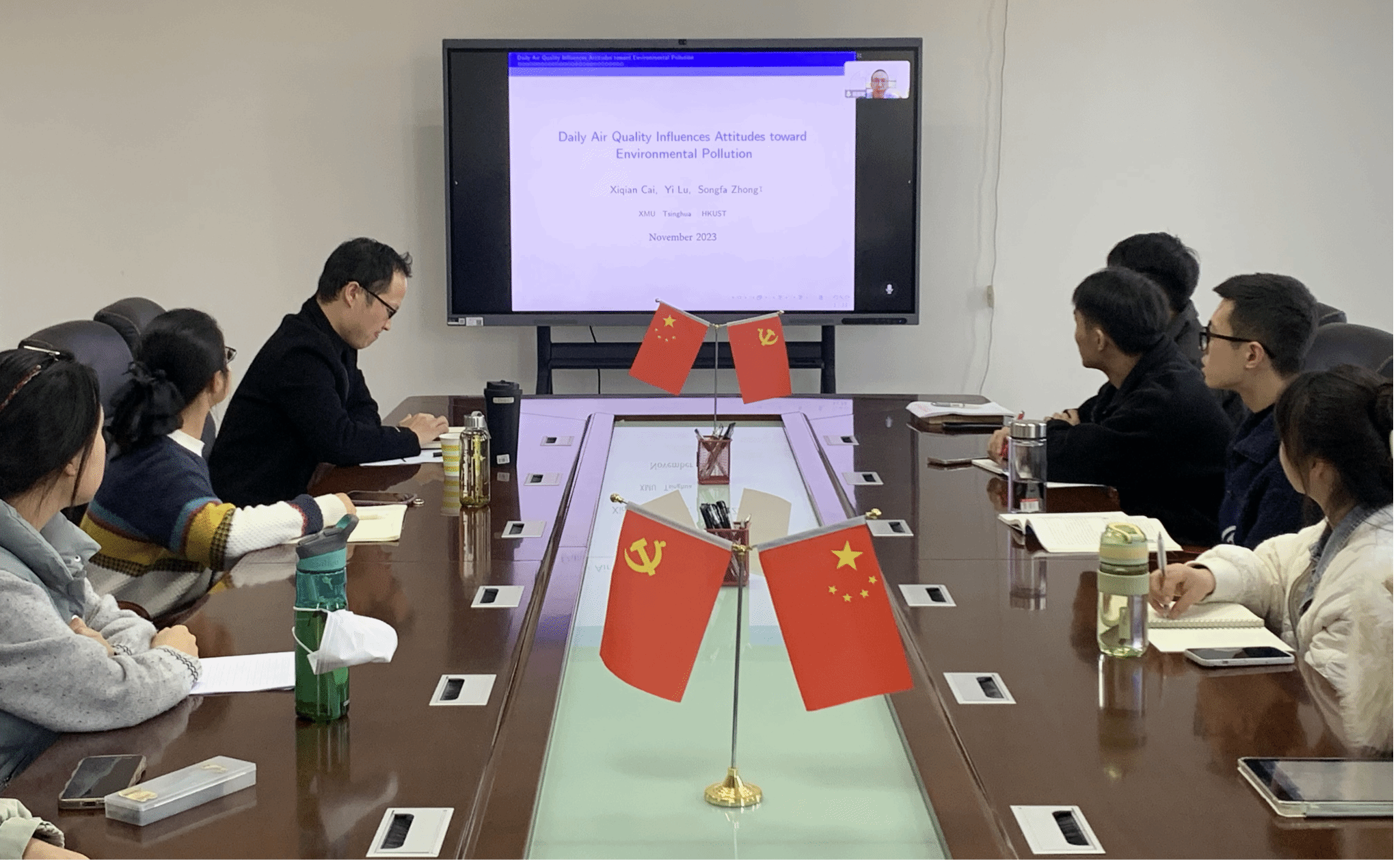 蔡熙乾教授通过对Ella的标志性案例进行介绍,引出研究问题,并且利用两套微观调查数据与城市数据进行匹配,实证分析了每天空气质量如何影响人们对未来遭受空气污染风险的感知以及如何影响人们对与污染相关公益项目的捐款。研究发现,空气质量越差,人们越能感受到未来遭受空气污染的风险,人们也越愿意对与污染相关的公益项目进行捐款。整个报告内容详实、论证缜密。报告结束后,蔡熙乾教授与学院师生进行了互动交流,现场气氛十分活跃。(撰稿:丁玉龙、摄影:王天祥 审核:徐俊杰)