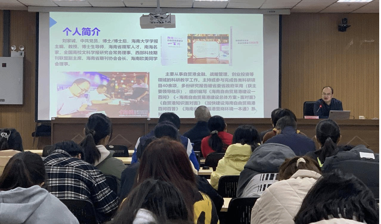 刘家诚教授围绕海南社会经济发展概况、选择海南作为自由贸易港的成因、海南自贸港“一本三基四梁八柱”战略框架、海南自由贸易港11大制度设计逻辑关系、全岛封关运作的具体举措等主要内容展开阐述。并对全岛封关所带来的未来商机进行分享,从“一线放开,二线管住”介绍了封关带来的有关商机,即一线放开的“零关税”商机、二线的“海南智造”商机等,并就此话题与在座师生互动交流,现场气氛十分活跃。